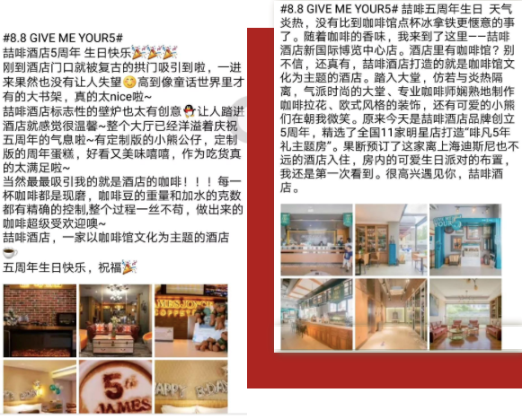 五周年期间,喆啡11家明星店推出了啡凡主题房,受到了喆粉和各路旅游达人的喜爱。各路旅游达人、摄影大师从不同的城市前来,体验喆啡倾情打造的“啡凡5年礼主题房”。精心布置的派对主题房获得喆粉的一路好评,纷纷在社交媒体平台高调晒出好评体验感。